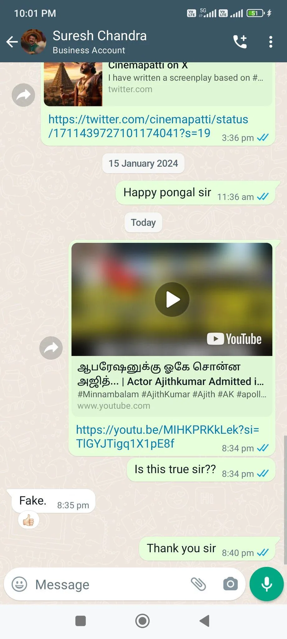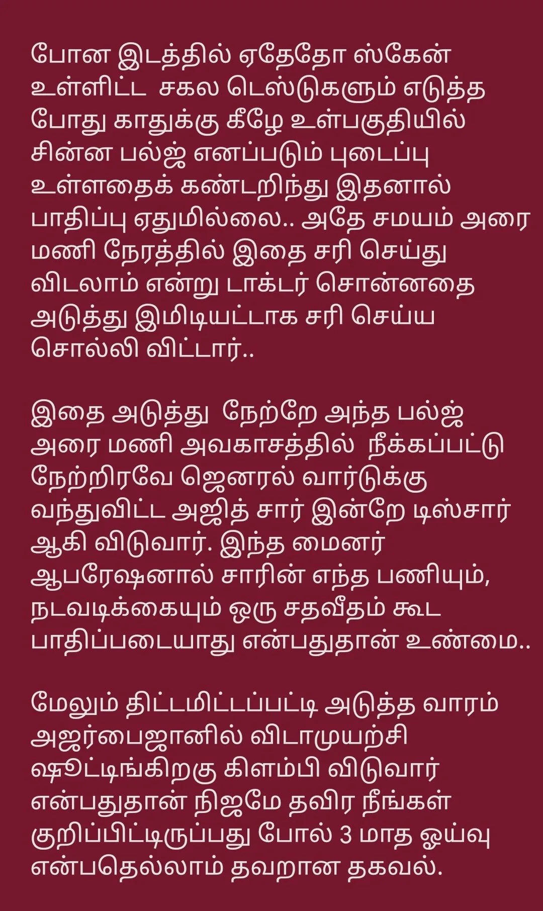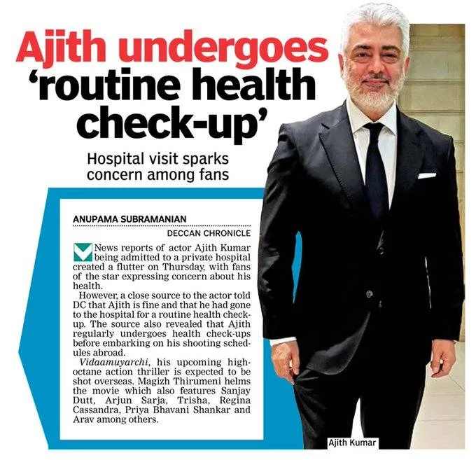 அந்தச் செய்தியின் நம்பகத்தன்மை இன்னும் தெரியவில்லை. நடிகரின் செய்தித் தொடர்பாளர் அல்லது மருத்துவமனை நிர்வாகத்திடம் இருந்து அதிகாரப்பூர்வ வார்த்தைக்காக நாங்கள் காத்திருக்க வேண்டும். ரசிகர்கள் தற்போது அஜித் குமார் நலம் பெற பிரார்த்தனை செய்து வருகின்றனர். மகிழ் திருமேனி இயக்கும் ரேஸி ஆக்ஷன் த்ரில்லரான ‘விடாமுயற்சி’ படப்பிடிப்பில் இருக்கிறார்.