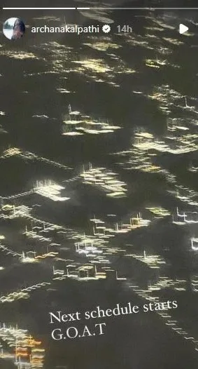 அர்ச்சனா கல்பாத்தி தனது அதிகாரப்பூர்வ இன்ஸ்டாகிராம் கைப்பிடியில் விஜய்யின் அடுத்த தலைப்பிலான கிரேட்டஸ்ட் ஆஃப் ஆல் டைம் அல்லது GOAT படத்திற்கான புதிய ஷெட்யூல் தொடங்கப்பட்டுள்ளதாக அறிவிக்கும் கதையைப் பகிர்ந்து கொண்டார். ஏஜிஎஸ் என்டர்டெயின்மென்ட் பேனரில் அர்ச்சனா கல்பாத்தி கோட் படத்தைத் தயாரிக்கிறார். இந்தப் படத்தை வெங்கட் பிரபு இயக்குகிறார்.